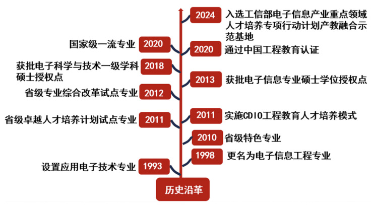 专业源于1993年设置的应用电子技术专业,1998年更名为电子信息工程专业,2010年获批为省级特色专业,2011年获批省级卓越人才培养计划试点专业并开始实施CDIO工程教育人才培养模式,2012年获批为省级专业综合改革试点专业;2020年通过中国工程教育工程认证,同年获批为国家级一流专业;2024年,入选工信部电子信息产业重点领域人才培养专项行动计划实施单位。