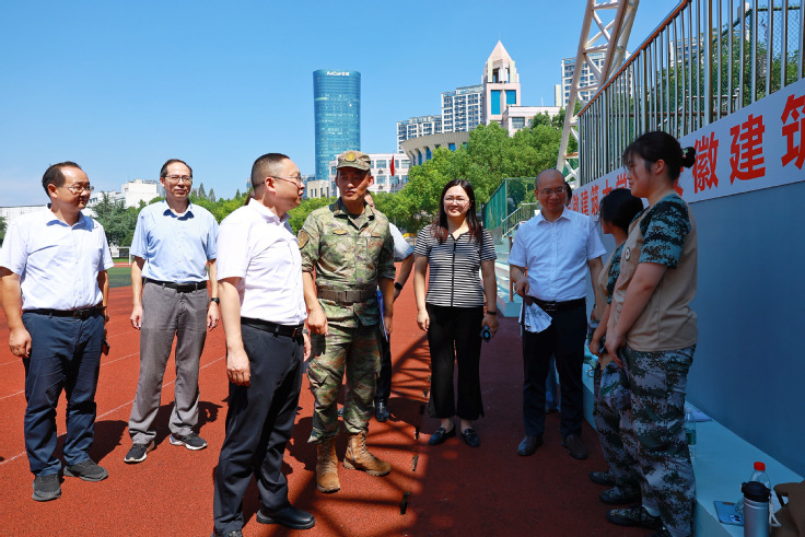 军训训练场青春飞扬、口号嘹亮。高跃峰在学院领导和老师的陪同下,看望金寨路校区2025级新生军训新生。现场,身着迷彩服的新生们精神抖擞,在教官的带领下高声传唱《强军战歌》;尽管额头的汗水顺着脸颊滑落,他们依旧保持着挺拔的姿态。高跃峰亲切慰问正在参训的新生和带队教官,仔细询问军训科目安排、后勤服务保障及新生适应情况,提醒教官要科学施训、劳逸结合,确保军训安全有序开展。